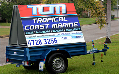 Trailer signs can include laminated stickers applied directly to the trailer, aluminium panel signs can be secured to the trailer, even frames can be built to regular box trailers to make them into mobile billboards! |